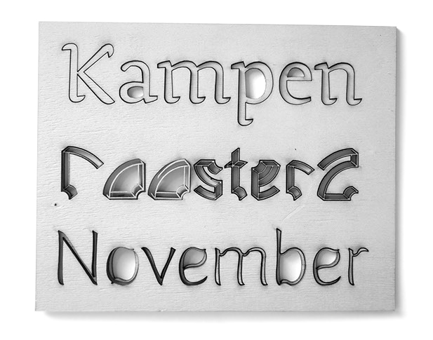 Een aantal lettertypen ontworpen door Peter Slager zijn bij wijze van proef uit een plaatje berkentriplex gesneden.